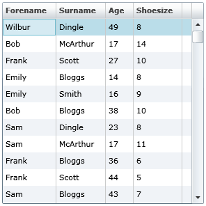 In the above XAML, the binding expression does not have a Path specified, therefore, the binding source is our Row instance rather than a property of the Row. The RowIndexConverter value converter simply uses the supplied ConverterParameter for each column to access the Row indexer and extract the correct value. This works quite nicely, and we are able to see our data within the grid: