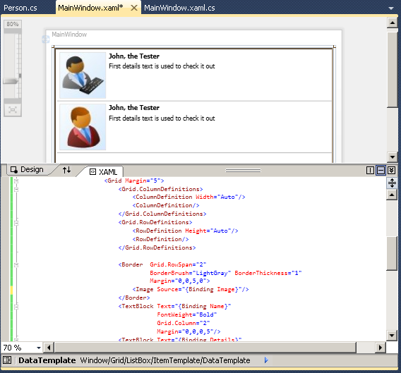 Finally, you can supply design time data to your WPF / Silverlight applications, allowing you to get immediate feedback when designing your templates, removing the time consuming build / execution cycle required with WinForms. The screenshot below shows how the listbox looks in visual studio: