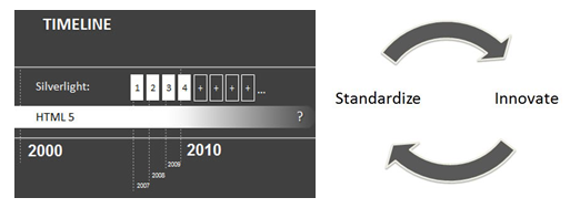 The above statements caused quite a stir, with calls for Bob to clarify his statements which seemed to contradict the recent "Future of Silverlight" blog post which contrasted the difference between standardisation (HTML5) and innovation (Silverlight) to show a very positive future for the technology. I think this is the first time I had seen such a direct comparison of HTML5 vs. Silverlight from Microsoft's Silverlight team, and the arguments they made were quite compelling.