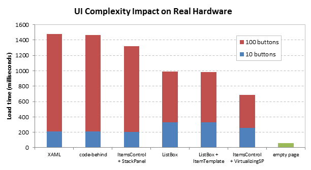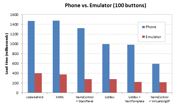 This blog post presents a few performance measurements that detail the relative performance of ItemsControl, ListBox and manual addition of elements to the UI. These performance measurements are also compared when ran on the emulator and the real hardware.