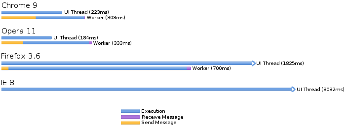 But there is definitely something strange going on with Opera! The time taken to construct the workers is almost equal to the total time required. This means the UI thread is busy whilst the workers are running, and the UI thread won't get to see any benefits as is the case with Chrome and Firefox. If Opera was more popular I'd spend time investigating this quirk, but it's not, so I won't!