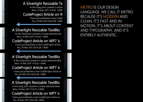 Silverlight for Windows Phone 7 provides a basic Metro styling for elements such as Buttons and Checkboxes, it also has a few phone specific controls such as Pivot and Panorama. These controls make it easy to create a basic Metro interface, although again, I refer you to Scott Barnes' blog, Metro is not all about black and white! However, when using a WP7 phone you will probably notice that the native applications, email, maps and settings, have a bit more 'flair', lists gracefully slide into view, or 'peel' off the screen when an item is selected. Metro is not just about static style, it is "alive in motion".