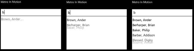 In this instalment of Metro In Motion I will show how to implement the fluid auto-complete effect that can be seen in the Windows Phone 7 email client. You can see a 'storyboard' for this effect below; the items within the auto-complete popup slide gracefully into view when the popup initially renders: