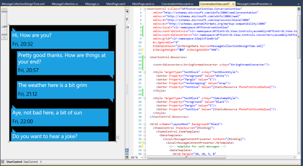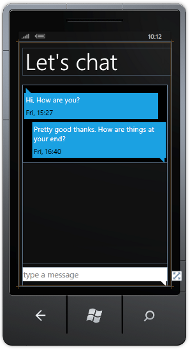 This blog post describes how to implement a conversation / messaging style application with Windows Phone 7. It covers how to style the speech bubbles and the scrolling of the conversation list view when the phone keyboard is shown.