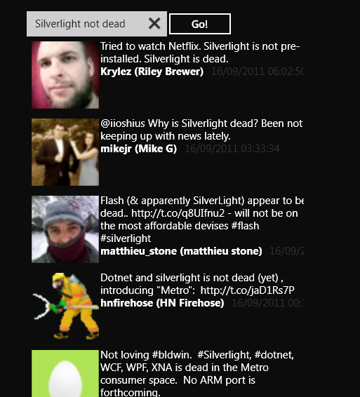 A screenshot of the TwitterSearch application built for WinRT Metro is shown below: