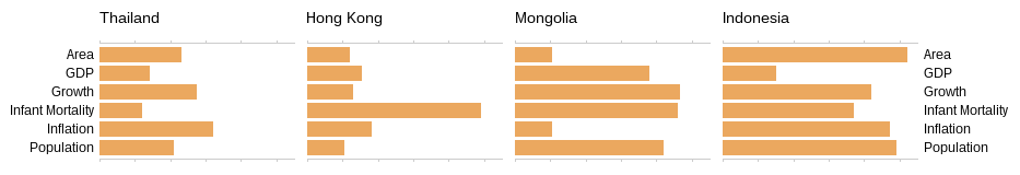 There are numerous more effective alternatives to radar charts, depending on the information being presented. These include bar charts, as shown above, line charts (particularly for timeseries data), parallel coordinates charts and, quite simply, tables showing the raw figures. The latter is commonly overlooked, but when dealing with relatively small, simple data sets it is frequently the most immediate and clear way to represent the information. In more complex cases, a more effective alternative to a radar chart can be to use a concept called small multiples, devised by Edward Tufte, in conjunction with bar charts. Using this approach, individual series are separated onto individual charts, all sharing a common x and/or y axis scale to enable meaningful comparison across them. This way it is easier to gain both a higher level overview and investigate at more detail because the clutter, occlusion and related issues common to complex charts, and particularly radar charts, are removed. The following chart is a redesign of