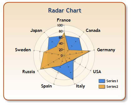 Occasionally the gridlines on a radar chart are presented as circles rather than straight connecting lines between equivalent values on adjacent axes, as in Chart 5. Conceptually, I do not understand how a chart can combine circular connections between axis values and straight line connections between series values. Surely they must adhere to the same notional underlying data space?! Otherwise the chart is fundamentally broken. If anyone feels like creating a radar chart using strictly polar data space for both gridlines and series shapes, could you please send me a link? I've never actually seen one, and always like a giggle...