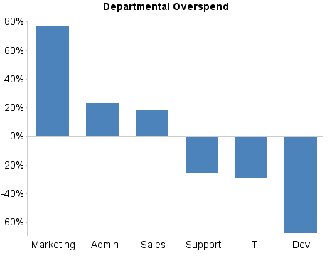 Furthermore, it can be assumed that in this case the relative over- and under-spend of the respective departments is the primary concern. By charting this difference as a percentage of the original budget and ordering the resulting bar chart from biggest overspend to biggest underspend, we have a very clear story of which departments are the worst offenders at both ends of the scale.