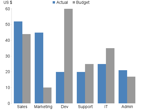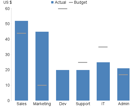 In the particular case of Chart 1, it is a fairly safe assumption to say that the chart is ultimately trying to convey the over- and under-spend of the respective departments. As such, the following redesign focuses on the more important value, the actual spending, and its relationship to the budget, by reducing the visual salience of the budget values.