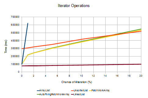 , I set up a simple test rig that allows you to compare the time it takes for different list implementations to perform a series of operations, where the chance that an individual operation alters the state of the list (adds to it, or removes from it) can be set. In general, operations on lists are either performed by accessing the elements via their indices (by-index) or via an iterator. The difference is that an iterator maintains a position in the list, whereas when you perform an operation by index you first need to locate the element in the list - which can take a significant amount of time, depending on the implementation. Due to this, there are two separate test methods - one for each use case.