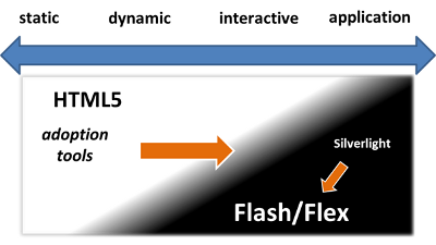 Overall, my impression is that Adobe have a similar view on how HTML5 and Flash will play out in the short and long term to the one we laid out in our white paper. Namely, in the short term, the richer, more interactive and dynamic the content/application being developed requires, the clearer the choice for Flash/Flex over HTML5 is. However, over time, as tooling, developer skills and technology improve, and the spread of mobile devices continues at its current pace, HTML5 is likely to become the "better" choice rather than Flash/Flex.