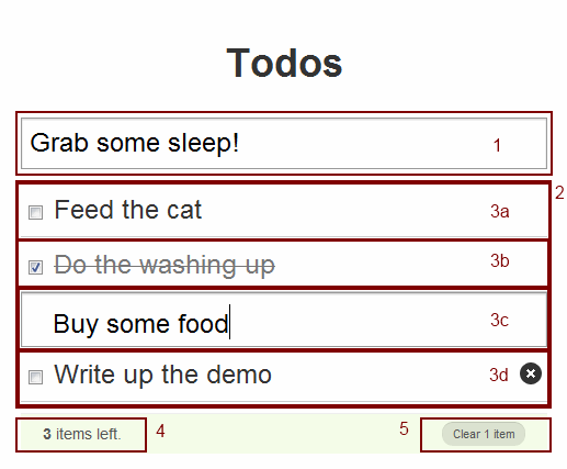 The application itself is a very simple to-do list, featuring adding items, editing items, toggling the done state of an item and removing items. For my Closure implementation I split the UI up as follows -