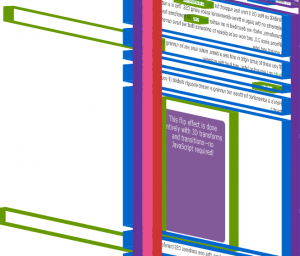 This screenshot also introduces one of the many quirks of this script, that of inline elements (in this case green) having very strange side-faces drawn around them. This is happening because the script uses the offsetX/Y/Width/Height attributes to position the side-faces. The wrapping of the inline element then plays havoc with this simplistic approach to measuring.