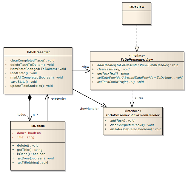 instances, this includes create, update, delete and persistence. The presenter exposes two interfaces, ToDoPresenter.View, which is the interface that a view is expected to implement, and ToDoPresenter.ViewEventHandler, which is an interface that handles view 'events'. Each ToDoItem