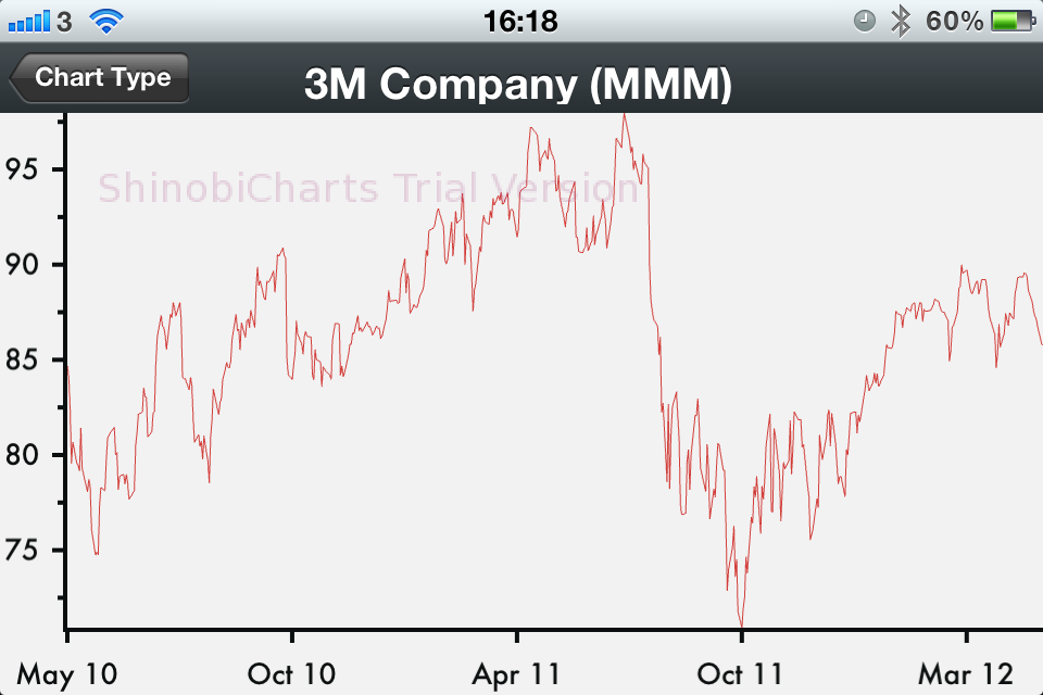 In this post, I explore four of the available iOS charting libraries and investigate the features, API, and pros and cons of each. In order to conduct a fair investigation, I have developed a comparison framework which loads historic stock market data from the Yahoo Finance API. My findings were that Core Plot had a strong set of documentation, yet was a little light on features and built in functionality. Shinobi Charts had super fast performance, was extremely easy to integrate and had a clean, friendly API. The iOS:Chart library from Three D Graphics had a large number of chart types, but had a very confusing API and poor documentation. KeepEdge was difficult to install with another poor API, and also threw unhelpful exceptions when adding data. I have documented my setup and usage experiences of the four libraries below.