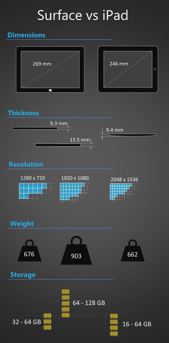 Reports from journalists who have had a chance to have a brief play with Surface seem to indicate that it has the same top-end feel that an iPad has. It also has another trick up its sleeve - the keyboard. The Surface has a magnetically attached fold out cover, much like the iPad, however, the Windows Surface cover also doubles as a keyboard. To my mind this further underlines the Surface being pitched as a productivity tool, especially the Pro model.