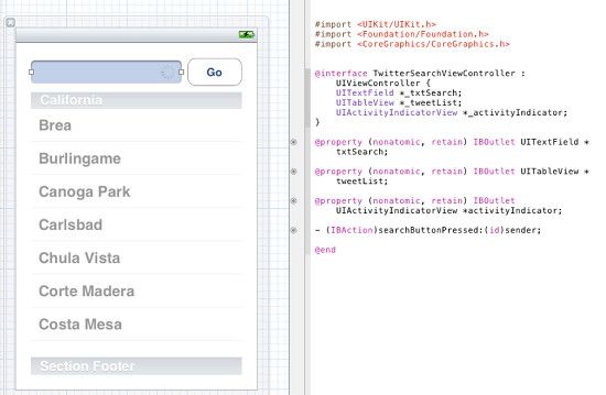 Interface Builder also allows you to wire up controls and their 'events' to your Objective-C code, using outlets and actions. The screenshot above shows how I have created outlets for the text-field, activity-indicator and table-view controls, together with an action which is invoked when the search button is pressed.