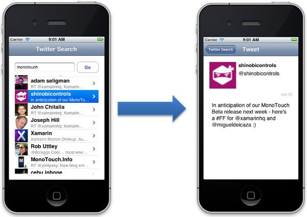 In this blog post I'll share my impressions of MonoTouch and the first application which I wrote. As a starting point I decided to create an iOS port of the simple Twitter-Search application I developed a few months back to demonstrate the use of the MVVM pattern for Windows Phone development.