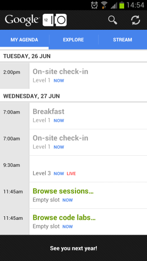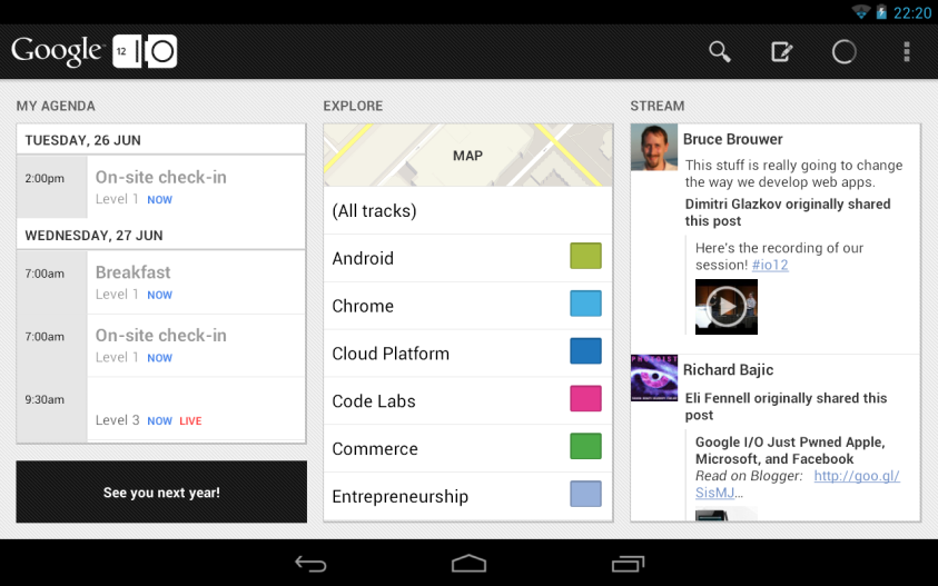 The prime example of how this layout technique works is the iosched 2012 application. There are three top level items: an agenda, a live social network feed and a list of available conference sessions. Tablets display three side-by-side views: