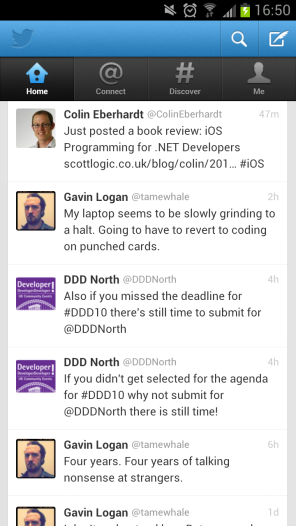 Twitter has a similar, although less complete, implementation of this pattern. It does not yet have a tablet-optimised layout and its customised header style is too closely-linked to iOS. On Android it is common to use text rather than icons as tab headers.