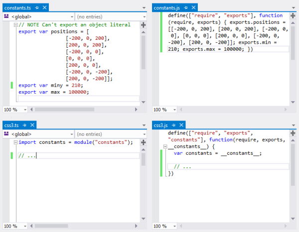 - The module pattern works well both inside Visual Studio for Intellisense but also from the command line when compiling the modules into either AMD or CommonJS format.