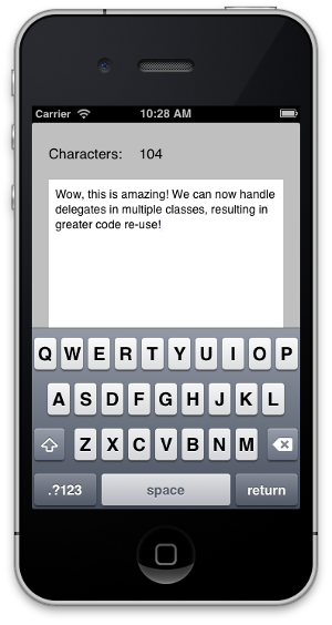This implementation looks pretty good, but there is still room for improvement. In the above code, any class that wishes to handle message sent to the delegate must obtain a reference to the SHCMulticastDelegate instance. It would be much better if the multicasting capability could be added to the UITextView