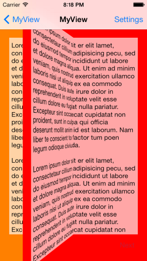 At this point, if you rotate one of the snapshots you will notice that it rotates around its center point. To rotate around on of the edges of a view you need to set the anchor point of the layer. Unfortunately this will result in an offset being applied to the layer’s frame, so I created a simple utility method that compensates for this effect: