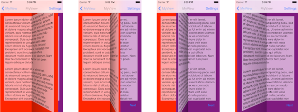 A simple alternative is to take a couple of ‘snapshots’ of each view, one for the left-hand side and one for the right-. Fortunately iOS 7 provides a new UIView-Snapshotting API which allows you to quickly and easily create a light-weight snapshot of a view hierarchy, or a region of a view.