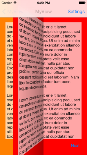Now to add some more realism … as the page turns, it helps to give the impression of depth by rendering a subtle gradient. In order to add a gradient, the snapshot views are replaced with new views that contain the snapshot, with a gradient view placed over the top.