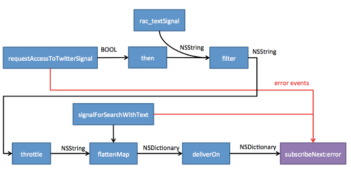 The above first signs in to twitter, then switches to a new signal which receives events when the user types in text into a search field. This is filtered so that it is more than 3 characters in length, throttled so that updates are sent twice per second, this then kicks off a twitter search, the results are marshalled back onto the UI thread, finally Linq-to-ObjectiveC is used to transform the returned JSON objects into a simple RWTweet