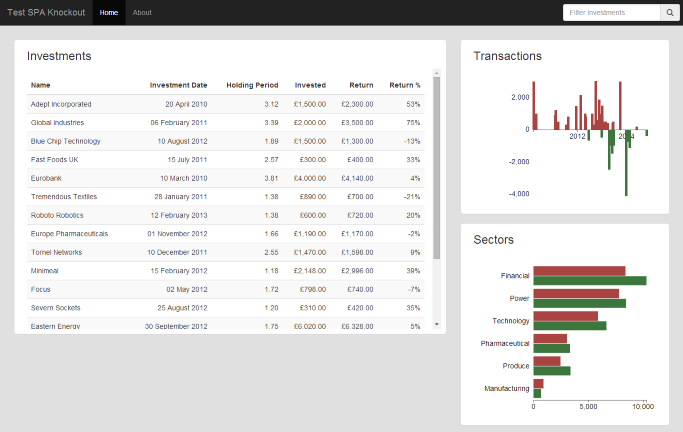 I chose a simple investment portfolio, showing a list of investments with transactions, and some related charts. You can filter the investments by name, and can also click through on each investment to view additional details. The finished project is on GitHub: Angular-vs-Knockout, with a live demo of both versions of the app here: