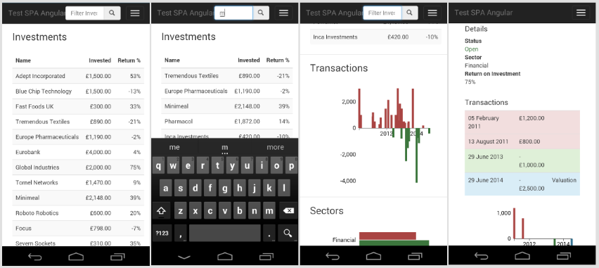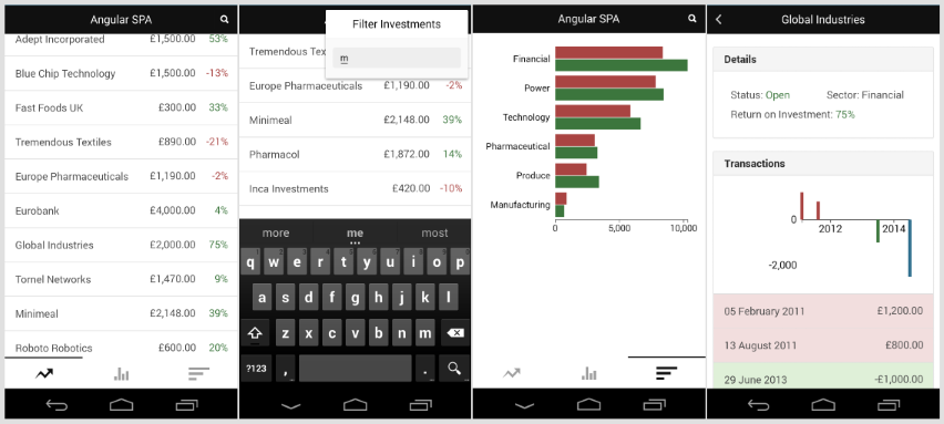 The ‘home’ page no longer has all three components displayed at the same time, but uses Ionic’s tabbed view to show them one at a time. Clicking the search icon raises a pop-over window with a search box. Clicking one of the investments initiates a slide-left animation to show the investment details with a back button. The Ionic version looks and feels much more like a native mobile application.