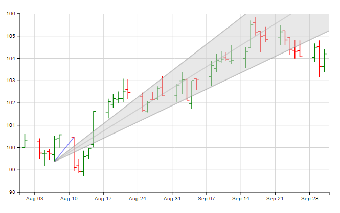 to calculate the gradient of the trend line, and using this we calculate the Y co-ordinate of the line that would exist if we continued this line all the way to the rightmost edge of the chart, as well as the Y co-ordinates of the fan lines (we can calculate these by using the Fibonacci ratios of 0.618, 0.5 and 0.382). Rather than drawing the fan lines in the right place immediately, we add a little visual flair by first drawing them at the highest point (usingsetFanLines()