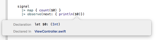 The simple code examples above show some of the benefits that Swift brings to ReactiveCocoa. The use of generics for defining signals means that you get type safety when observing events. Furthermore, type inference means that while some of the types you are dealing with are pretty complex, involving nested generics, you don’t have to explicitly declare the generic types.
