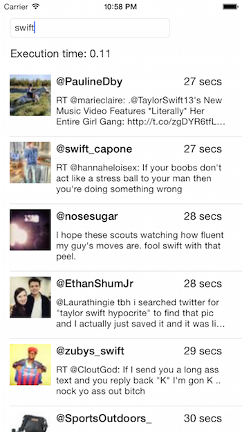 The app searches for tweets containing the given text, automatically executing the search as the user types.