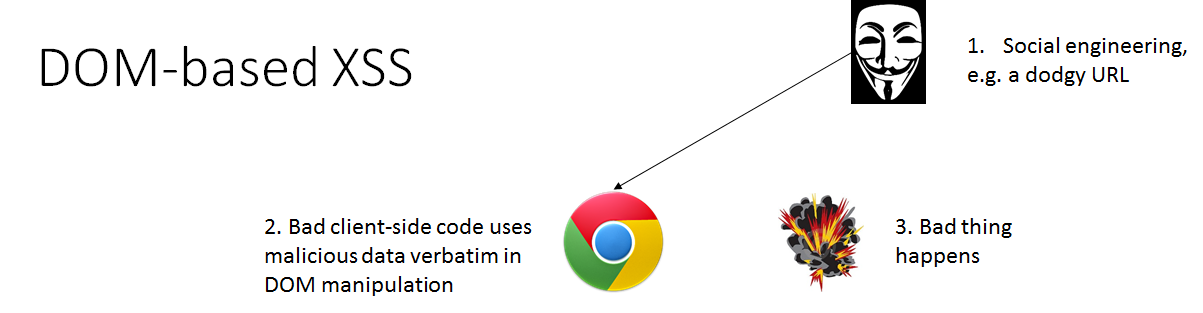- The browser renders (or otherwise processes) the DOM, running the malicious data as commands. The bad thing (whatever the attack was - e.g. sending user data or session IDs to the attacker) happens.