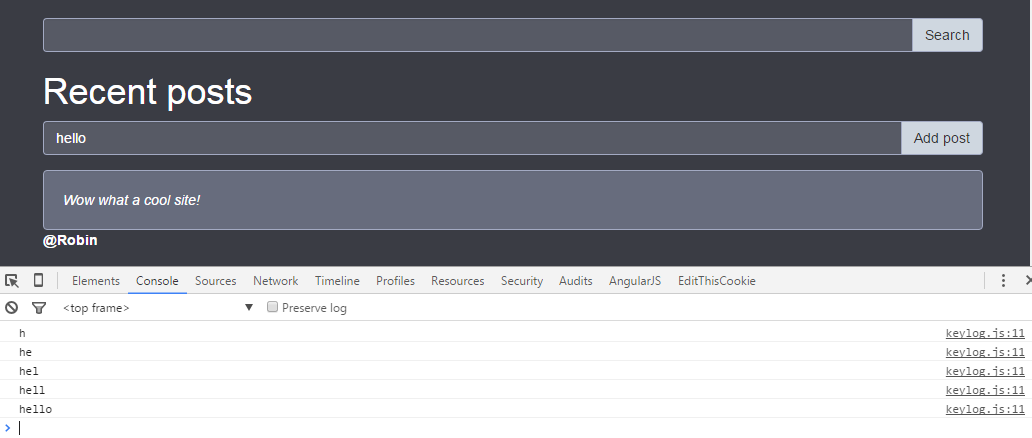It looks like a fairly bland and spammy post, but behind the scenes, the script tag is loaded and the attacker’s script is run. Type a few characters, and fire up Dev Tools and the console should show what you’ve been typing. Now, open up the attacker’s site and you’ll see that as you type, your keystrokes are being sent to the attacker’s site and are updating in real-time. Everyone who visits the page is vulnerable. If you’ve played with BeEF (see above) you may also have come across its Man-In-The-Browser command, which illustrates the fact that this keylogger attack could potentially be extended beyond the confines of the Posts page and into the Login page. Again, we’re not going to do that here - we’re interested in defending against the XSS vulnerability that opens the door to these attacks.