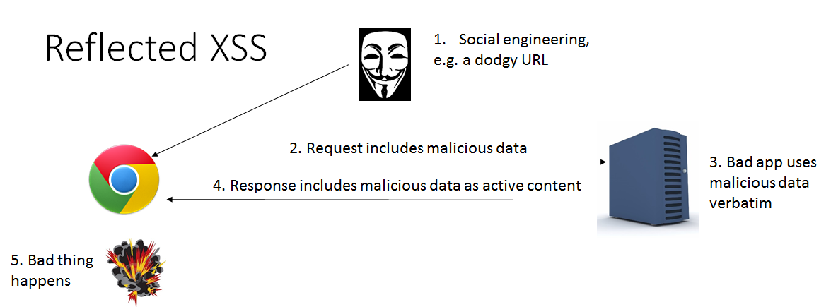 - The attacker provides the victim with some malicious data. This is often done by persuading the victim to clicking on a link, with the malicious data embedded in the URL. At this point the malicious data is still just data.