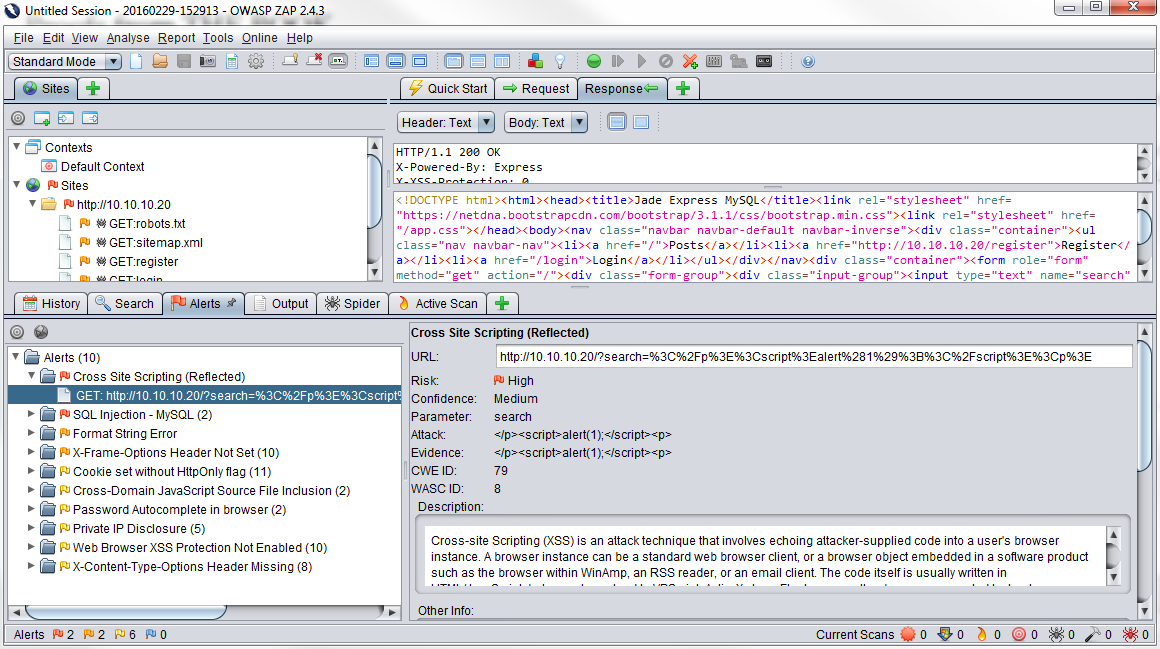 Now try an active scan of both sample apps (at 10.10.10.10 and 10.10.10.20). This will take a few minutes, but should reveal (in the Alerts tab) a bunch of issues, including an XSS vulnerability and the SQL injection vulnerability we already know about from the previous module. It’s worth taking a closer look at what it actually found though - a Reflected XSS vulnerability in the Jade_Express_MySQL app only, not the stored XSS vulnerability we also know about, nor the DOM-based on on the MEAN_Stack sample. This is because of the way this tool (and similar ones like BurpSuite) work - it can operate as HTTP proxies, but in this case it is hitting known endpoints with GET and POST (as appropriate) requests with fuzz testing payloads. It doesn’t know the sequence of requests it needs to set up the conditions to trigger the Stored XSS attack.
