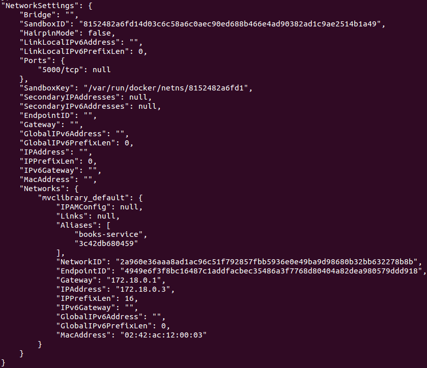 You can discover the IP address of a running container by inspecting it. I’ll start a container from the niksoper/netcore-books