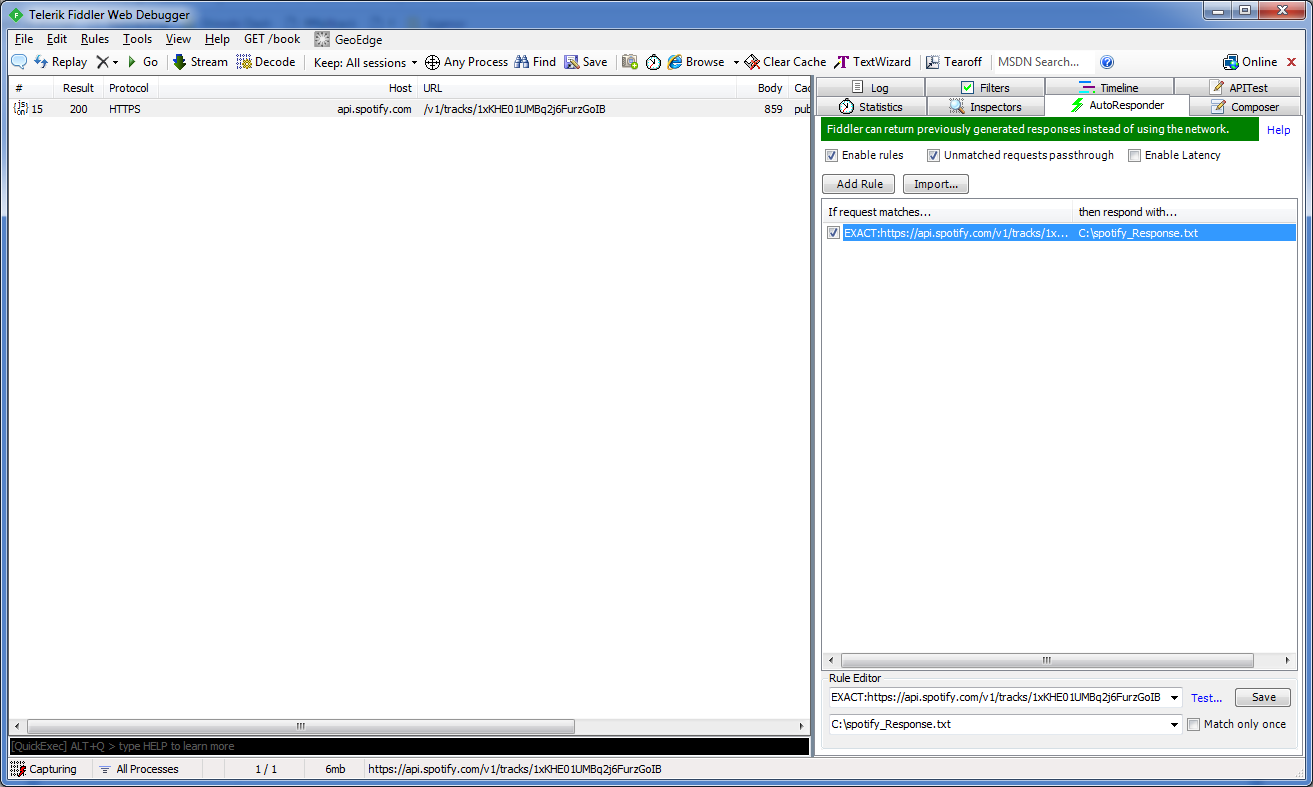 The response is set by using the second dropdown in the rule editor. There are multiple defaults such as 200 OK, 401 Unauthorized, or 404 Not Found, which are handy for testing your site against missing data or other responses. For now, we want to respond with the text file we edited earlier, so need to pick “Find a File” and choose the one we edited. Click Save and then “Enable Rules”.