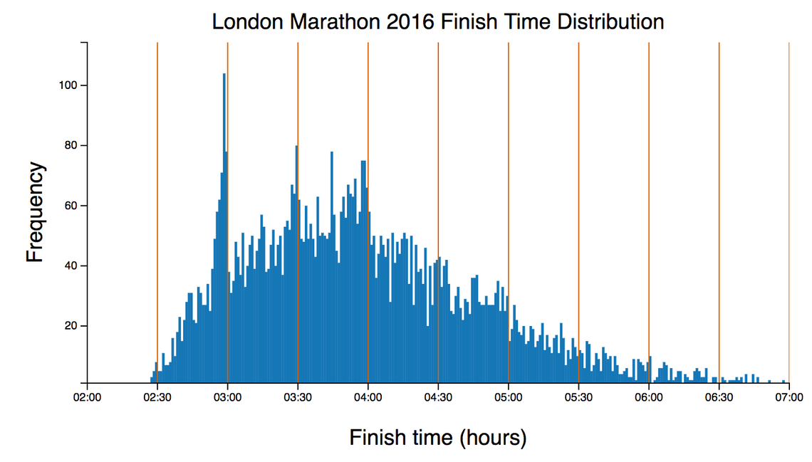 You can see a very prominent clustering of times, just under 3 hours, 3:30 and 4 hours, again, highlighting the popular target finish times. You can also see smaller clusters around 2:45 and 3:15. It’s pleasing to see so many people successfully achieving their sub-3 hour goal (that’ll be me one day … I hope!)