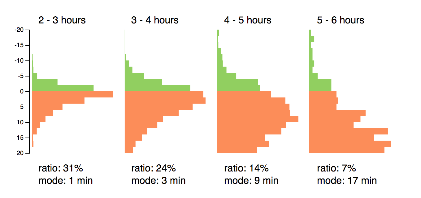 You can see that those runners that finished between 2-3 hours, 31% managed to run a negative split, with the most common split being just 1 minute. The fastest runners in a marathon are very experienced and consistent. With each successive finishing band you can see that the negative split ratio rapidly drops, as does the mode (or most common) split time. Running a good marathon is something that takes practice and discipline, it’s not easy!