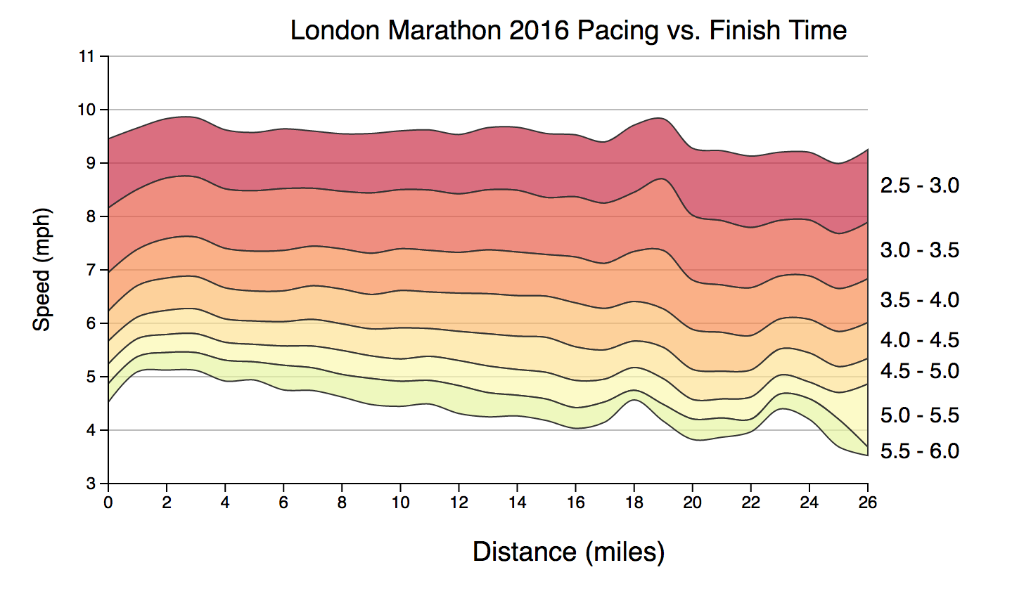 One of the first things I did is to render the pace distribution of all the athletes on a single chart to provide a quick verification that my data was correct (I’d had to do a few tweaks and corrections, converting km splits into mile splits). My intention was to summarise the splits data, however, I found it to be quite beautiful and rich in its most raw form.