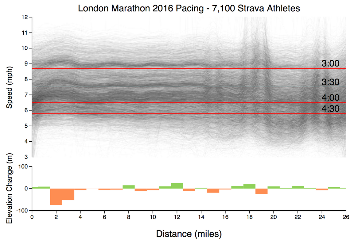 - Something funny goes on around mile 18-19, with many athletes making a change in pace, some faster, some slower. This could be due to elevation changes, which although minor, have a bigger impact on fatigued runners. Or, perhaps it is due to GPS inaccuracies? This part of the course takes runners through Canary Wharf, which has many high buildings.