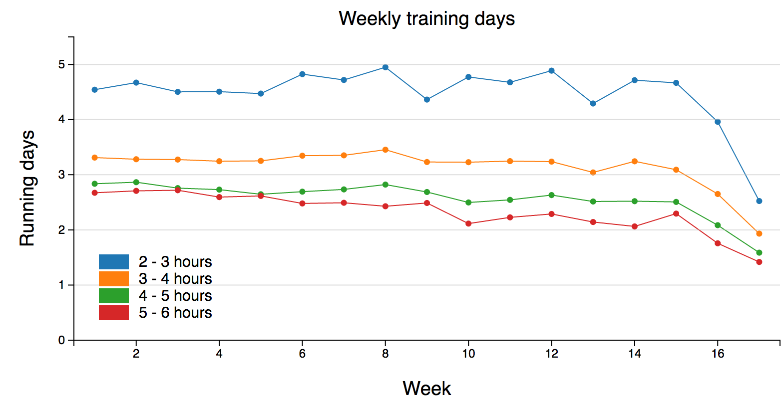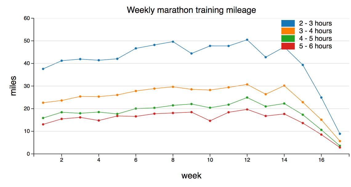 The above chart isn’t terribly surprising, with the faster finishers putting in more miles on a weekly basis. You can see a gradual increase in weekly mileage for the first 13 weeks, followed by a 3 week taper (a period of reduced mileage in preparation for the race).