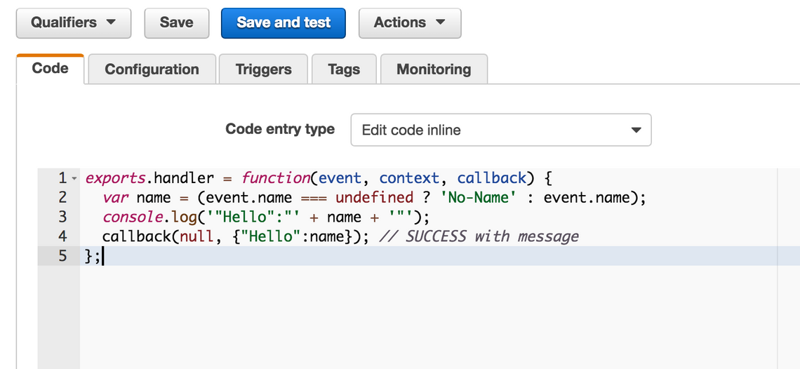 One you’ve created a Lambda, the AWS console allows you to editing via an online interface, a bit like CodePen, but relatively limited in it’s functionality.