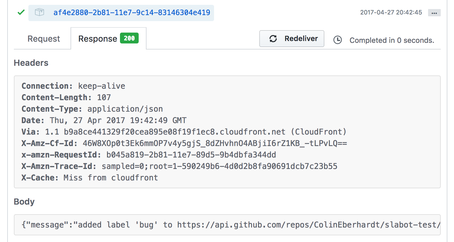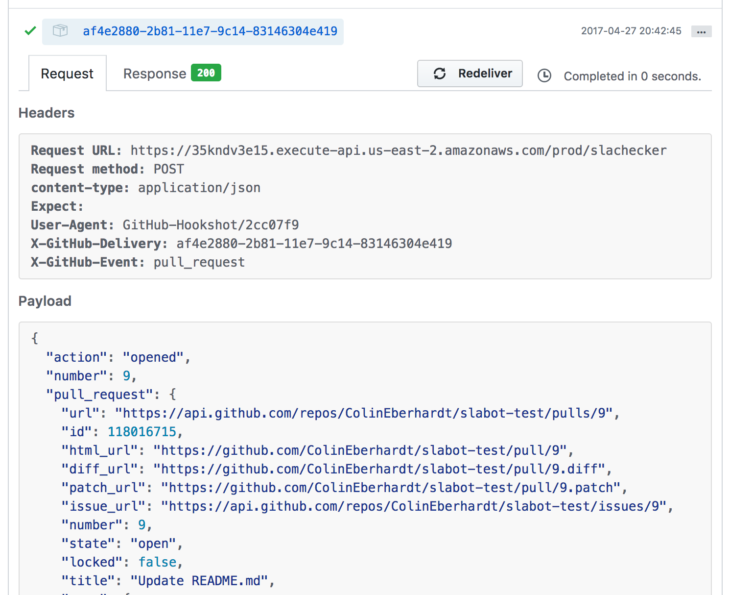 A really useful feature of GitHub’s webhook interface is that it stores the inputs and outputs of recent invocations. Here is an example of the webhook invocation and its payload: