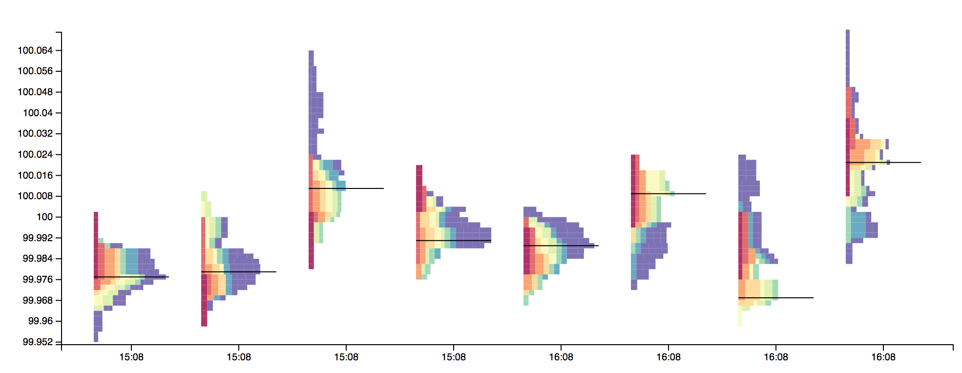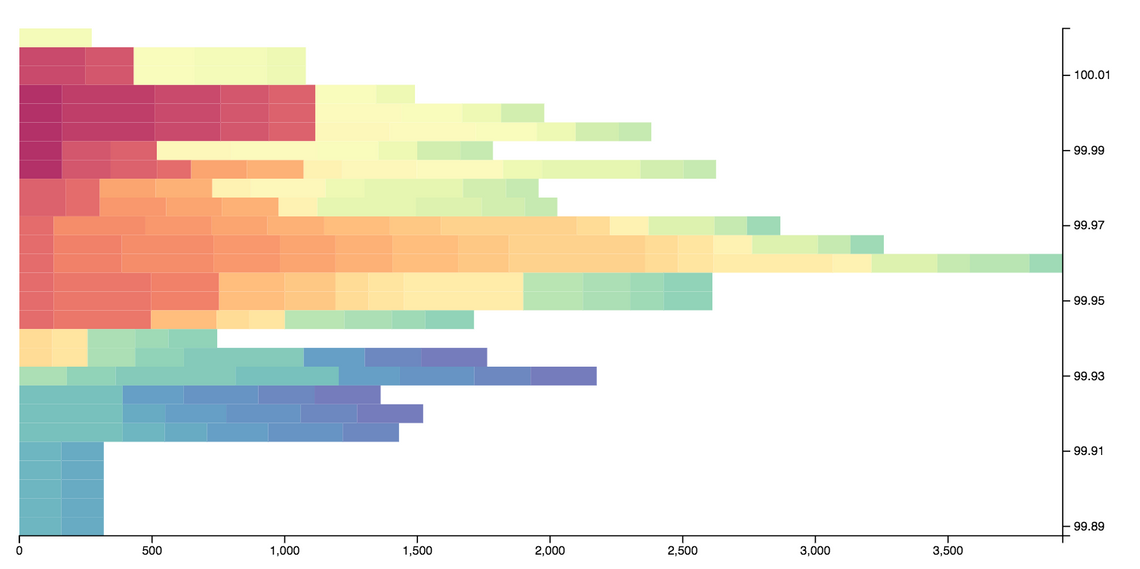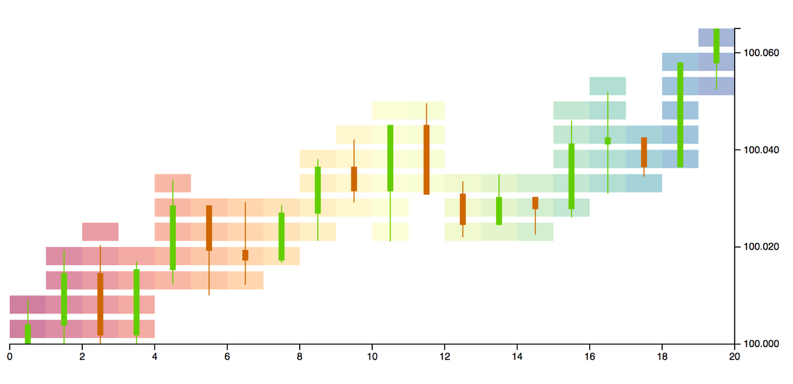 In order to create the market profile histogram, a suitable set of price ‘buckets’ needs to be calculated. The d3 scale ticks function is a convenient method for creating these buckets, providing values that are “uniformly spaced, have human-readable values, and are guaranteed to be within the extent of the domain”.