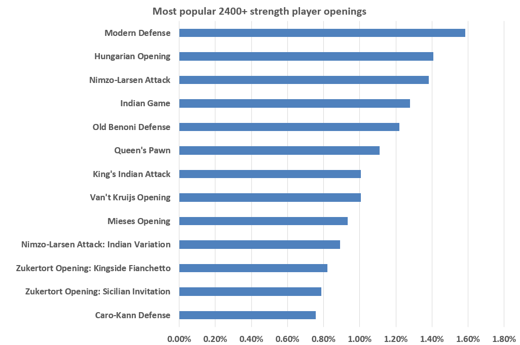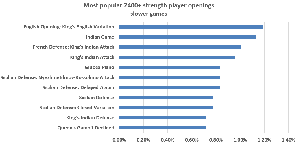 Here Modern Defense and Hungarian Opening are dominating the table. It seems that on the higher end of the blitz levels people prefer less theoretical openings. If we filter for only slower games: